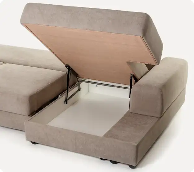 Технические моментыКаркас: ДСП 16 мм + сосновая фанера 15 мм. Сиденье: Пружина «змейка» + слои жесткого поролона (основной ST3540 100мм и усиленный ST3542 40мм). Мягкость: Все обшито холконом и синтепоном, подушки из суперпуха (шарики). Дно: Закрыто файбертексом (техническая ткань). Ножки — пластиковые треугольные или «стакан». Ящики: Из белого ЛДСП.